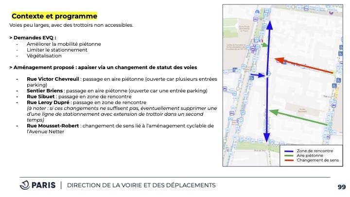 Nota : la présentation du 9 octobre 2024 annonçait l'inversion du sens de la rue Mousset-Robert, ce qui semble abandonné. Des différences entre la présentation et la réalisation apparaissent également rue Lasson, rue Montempoivre rue Rottembourg. On attend toujours le plan de la version validée.