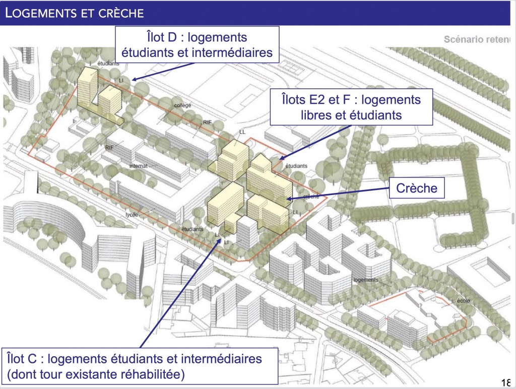 [...] La restructuration de la cité scolaire, nichée au coeur d'un vaste terrain de 3,5 ha, va en effet libérer de la place pour d'autres équipements. En plus du projet « scolaire », sont notamment prévues les constructions sur le site d'un internat de 150 lits, d'une crèche, d'une nouvelle école primaire et d'un immeuble de 250 logements.